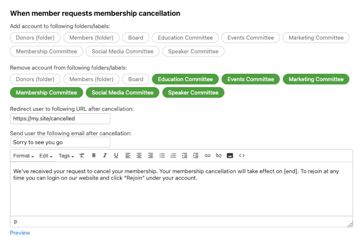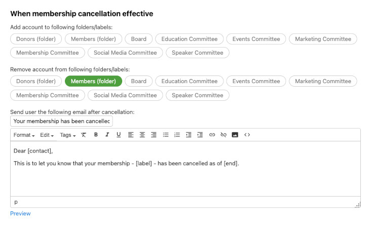 For example, you can send an email acknowledging the member's cancellation request with their upcoming cancellation effective date, then a separate email later notifying them that the cancellation has taken effect.