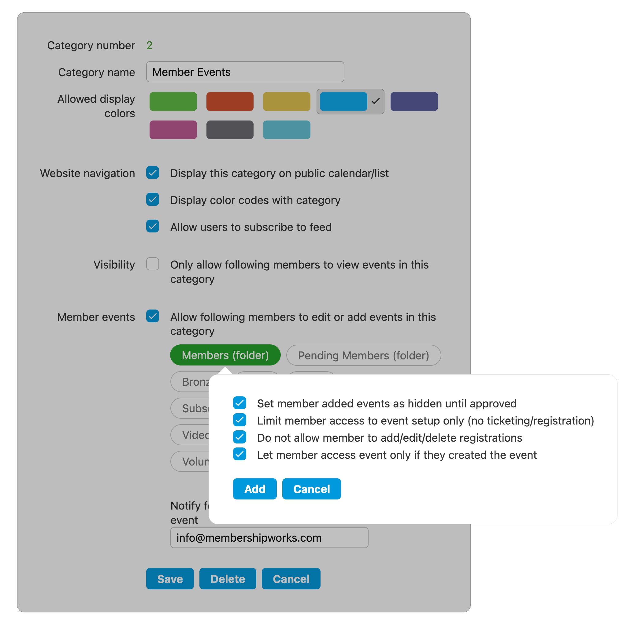 - Limit member access to event setup only (no ticketing/registration): You may want to allow members to add events to the