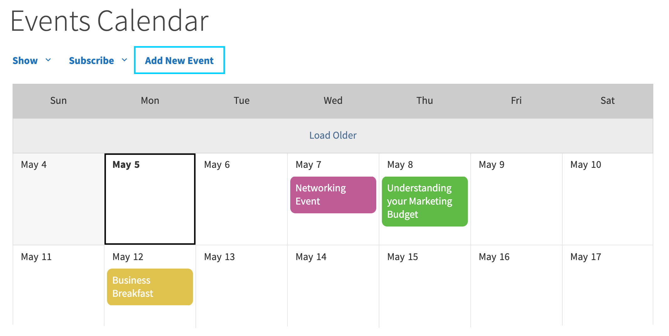 Once you create an Event Category where members can add events, an Add New Event link will appear on your website page where you have added your event calendar or event list that contains that Event Category. This link will only be visible to members who have logged in and are allowed to post events.