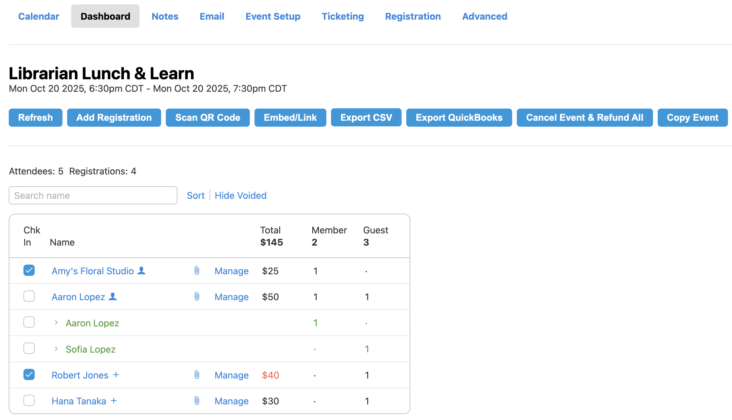 You can use the event Dashboard to check in registrants. From the Event List or Event Calendar, click on the event, then click on the Dashboard