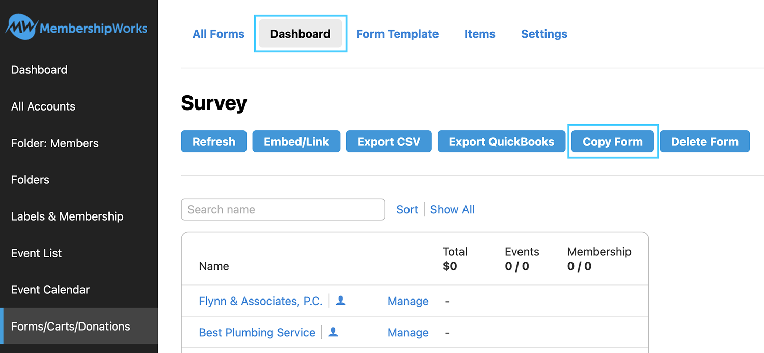 Go to MembershipWorks > Forms Carts Donations and click on the form on the right that you want to copy.