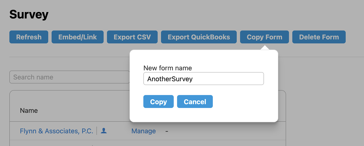 Enter a one word title for the new form using alphanumeric characters only and click the Copy button in the pop-up window.