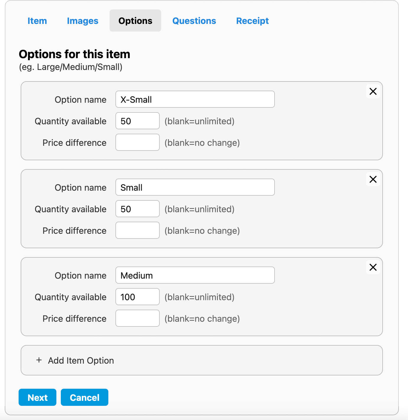 - Click Next or Save Item (the latter will appear if you have returned to edit your item)