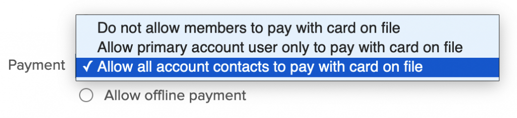 - Under “Payment”, you have an option to allow members to charge their card on file if: