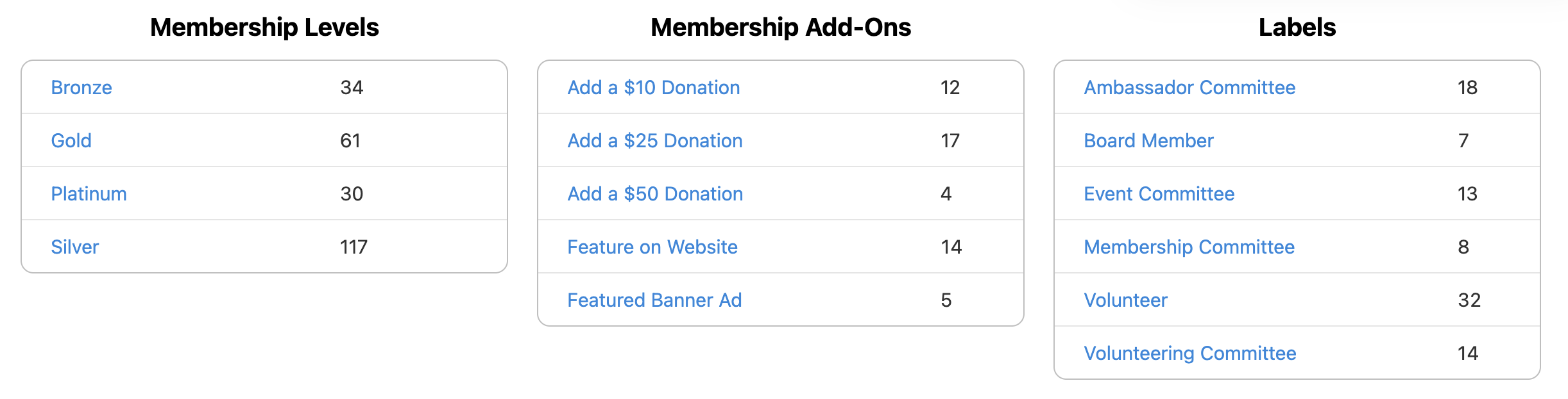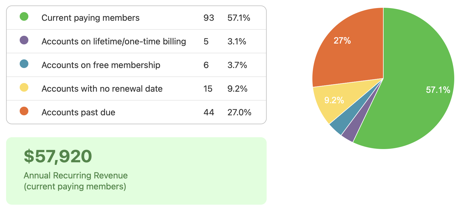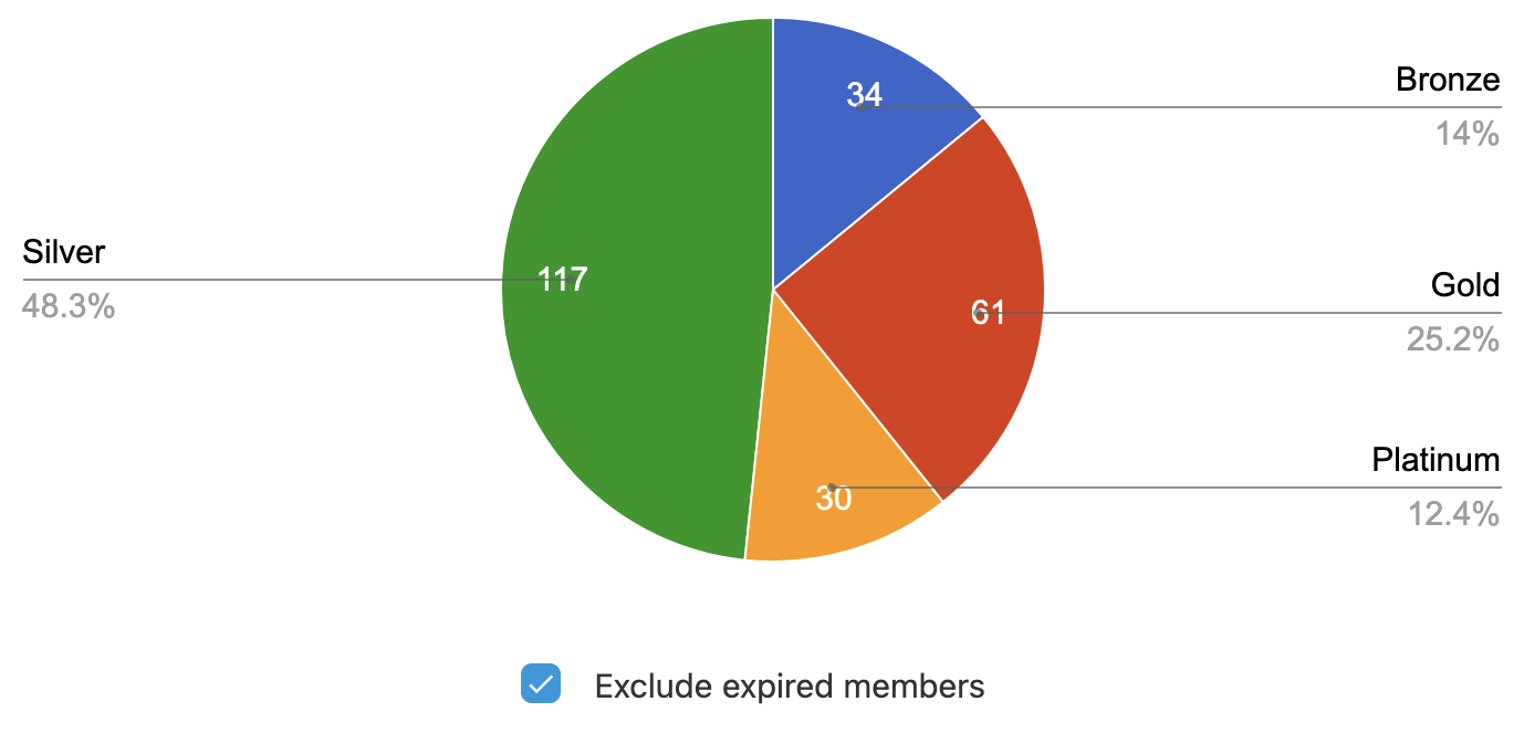 This section gives you a breakdown of how many accounts are on each membership level. You can enable the option below the pie chart to exclude expired members.
