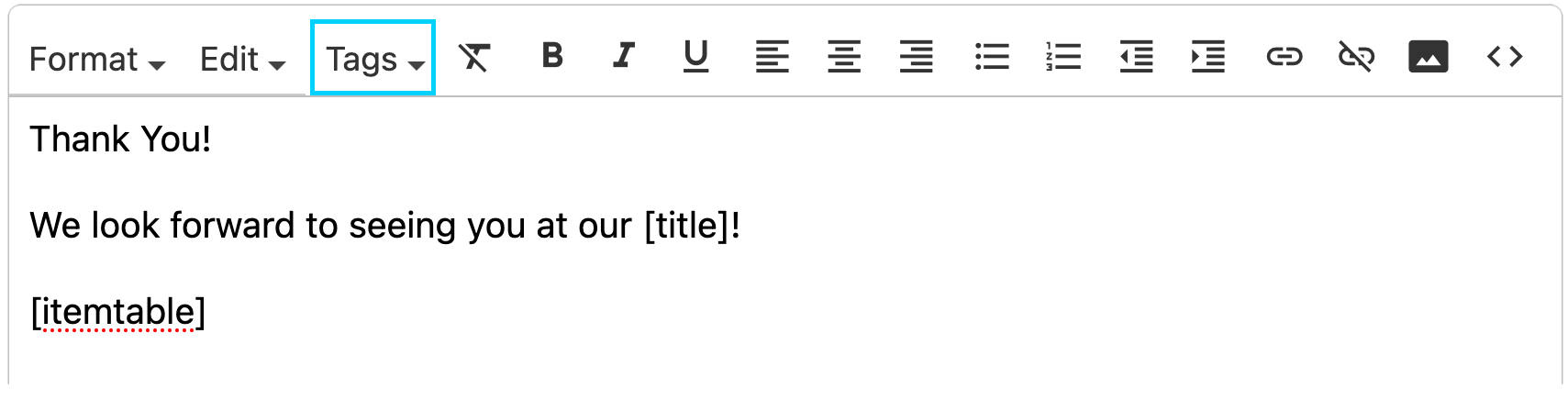 You can view a list of available tags by clicking on Tags in the email toolbar menu.