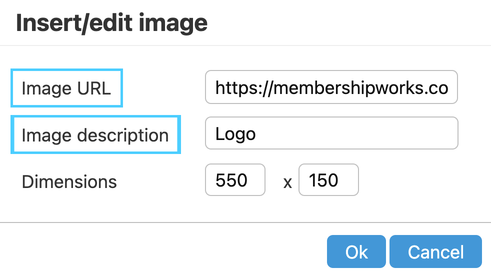 3. Next to Image URL in the pop-up dialog box, enter the URL where the image is located online. Next to Item description, enter a description of the image. You do not need to change the Dimensions. You’ll be able to resize the image after it’s inserted in the template. Click OK when complete.