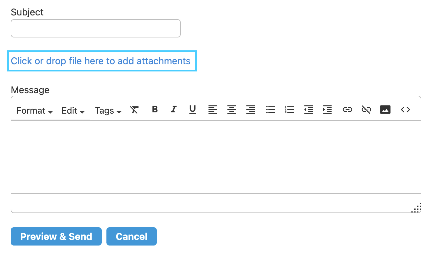 1. Drag and drop your file on the Click or drop file here to add attachments link above the email message box. Alternatively, you can click the link to select the file from your computer.