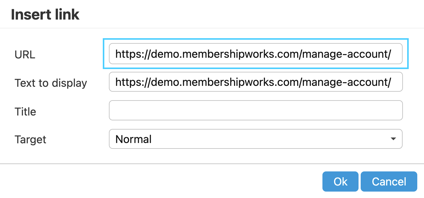 3. Next to URL in the Insert link dialog box, enter the URL where you want the text linked and click the OK button.
