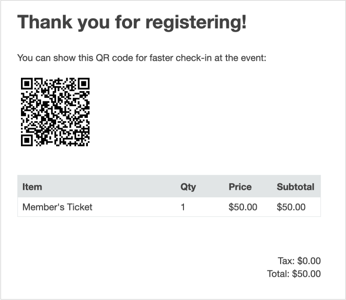 Each event has a separate confirmation email template so the confirmation email can include information specific to the event (e.g., venue information, parking instructions, etc). You can also add Tags to customize this email such as a QR code Tag that will generate a unique QR code that can be used to check the member in at the event. Here is an example of a confirmation email with a QR code added.