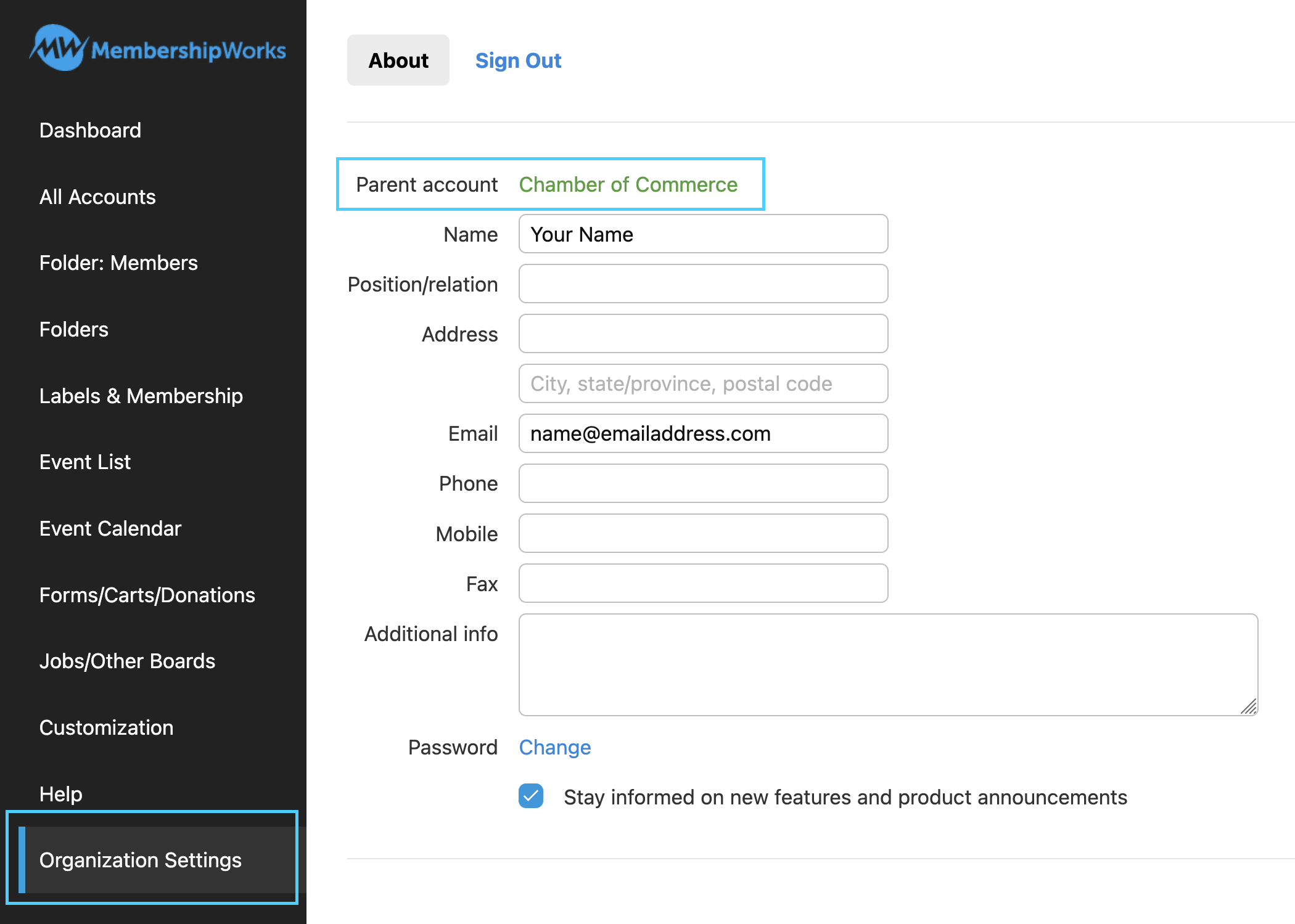 If you see a Parent account field that you are not able to edit (as shown below), you are logged in as a secondary admin.