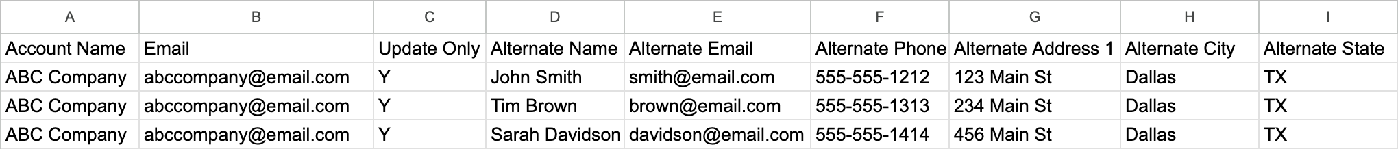 Below is a sample of what the import for the additional contacts would look like. The three additional contacts will be added to the main ABC Company's account.