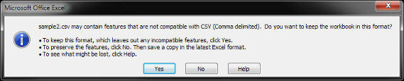 Excel may indicate that some features of your spreadsheet are not compatible with CSV, click