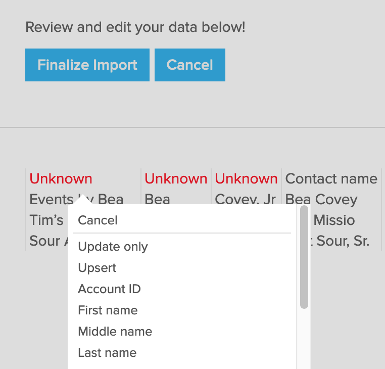 1 If your spreadsheet lists your member’s names as separate First Name, Last Name columns, you can use those columns instead of “Account Name”. During import the first name and last name will be joined together.