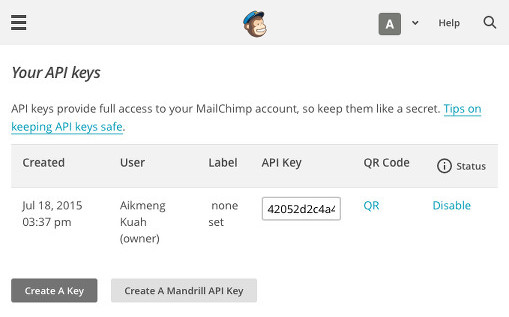 To connect your MailChimp email audience, you first need your MailChimp API key. If you do not have an MailChimp API key, sign in to your MailChimp account, and go to Account > Extras > API keys to obtain an API key: