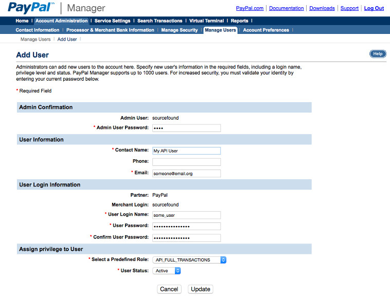 Sign in to PayPal Manager and go to Account Administration > Manage Users > Add User. to create a user. This user will only be used for our system to process transactions.