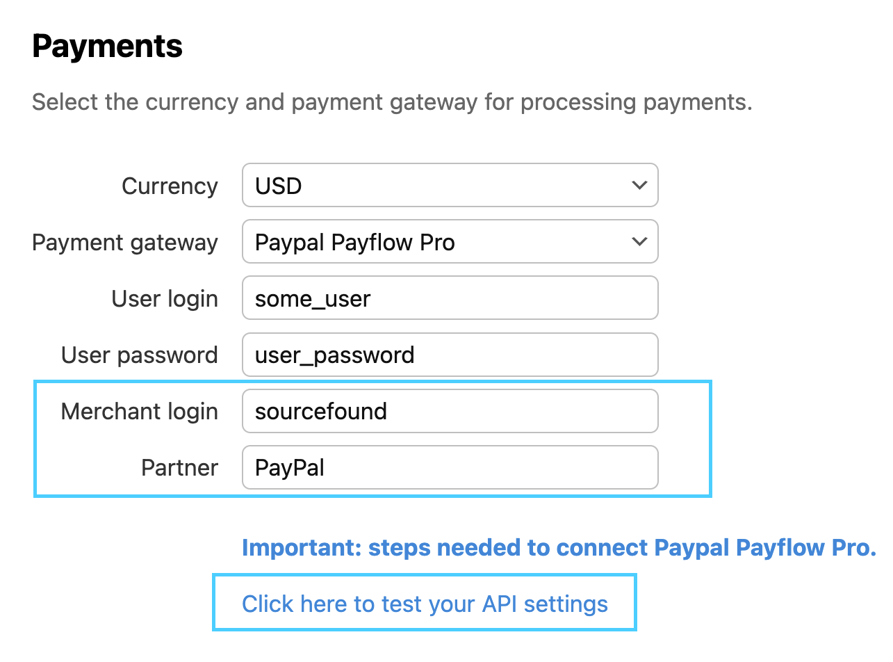 Click the Click here to test your API settings link below this after completing the fields to make sure your API keys are correct (note this only verifies if the API keys are correct, it cannot verify if your PayPal account is configured properly).