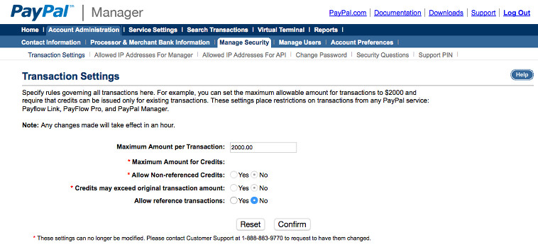 Sign in to PayPal Manager and go to Account Administration > Manage Security to ensure your security settings are suitable for the transaction amounts you will be processing.