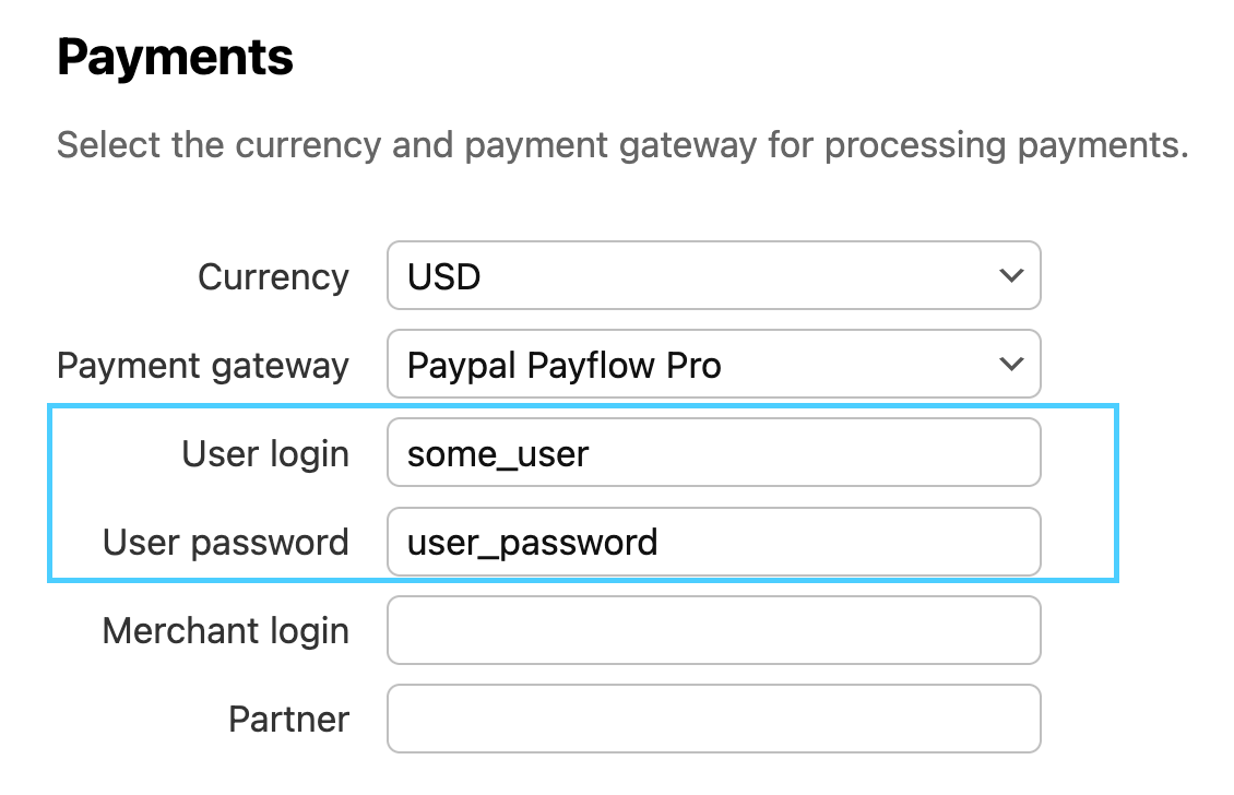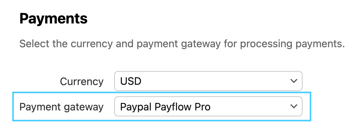 Go to the section titled Payments. Next to Payment Gateway, select PayPal Payflow Pro from the drop down menu.