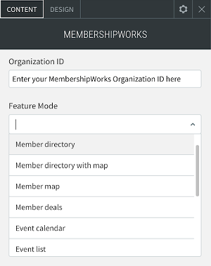 Enter your MembershipWorks Organization ID in the widget settings and select the feature mode you want such as Member directory, Event calendar, etc. You can find your Organization ID in MembershipWorks under Organization Settings.
