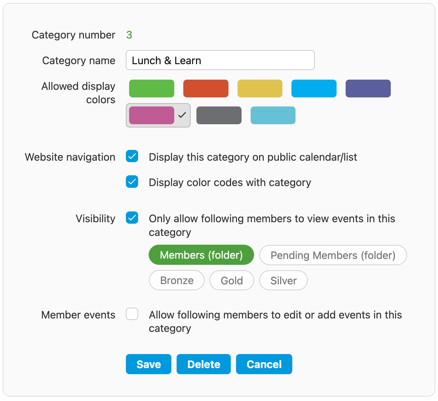 - Click on the event category you’d like to be visible to just members. If you have not created event categories yet see directions in “How to setup event categories” above