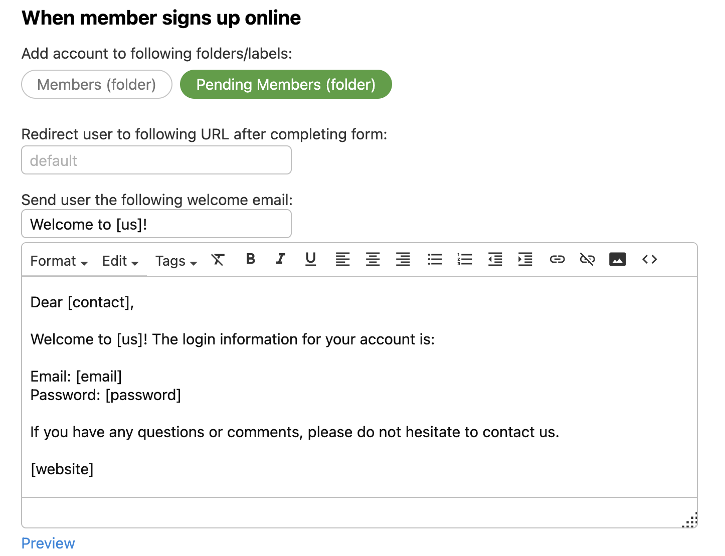A welcome email is sent automatically when new members sign up online. The default welcome email message includes the login credentials the member can use to login to their account.