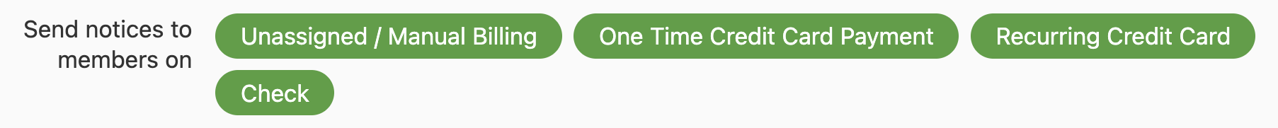 Next to Send notices to members on, you will see that all of the billing options, include Unassigned/Manual Billing, are selected. You can click to uncheck some of the billing options if you want the notice to be sent members on one particular billing option (e.g. Check, Recurring Credit Card, etc). However, if you uncheck any billing options, you will want to add a separate renewal notice to go out to members on those billing options.