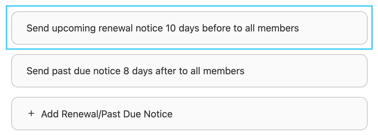 Click on an existing renewal/past due notice to edit it or click on + Add Renewal/Past Due Notice at the bottom to add a new notice.