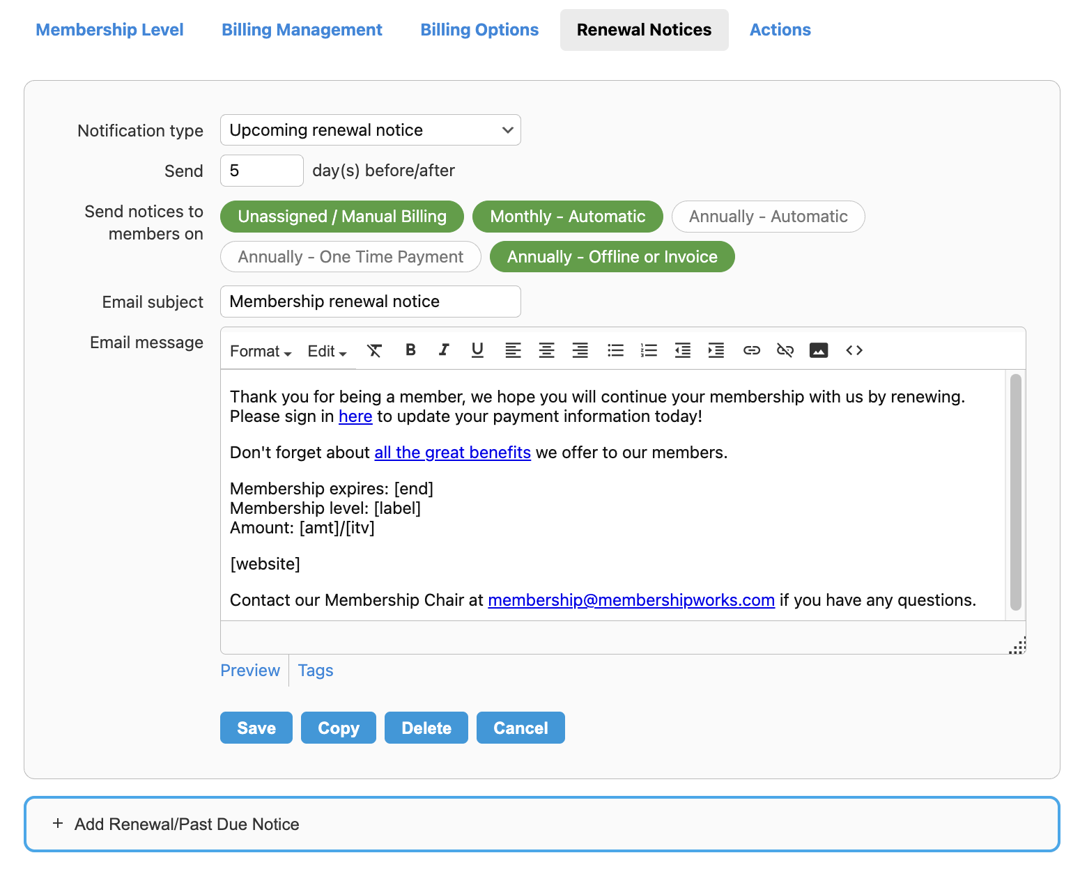 You can select to send either an upcoming renewal notice (before the membership expires), or a past due notice (after the membership expires).