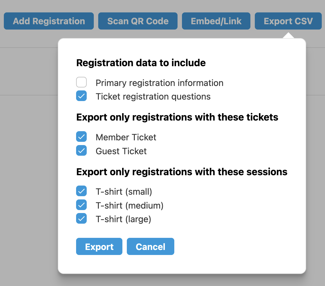 - Under Export only registrations with these sessions, select the items that you would like to include in the export list.