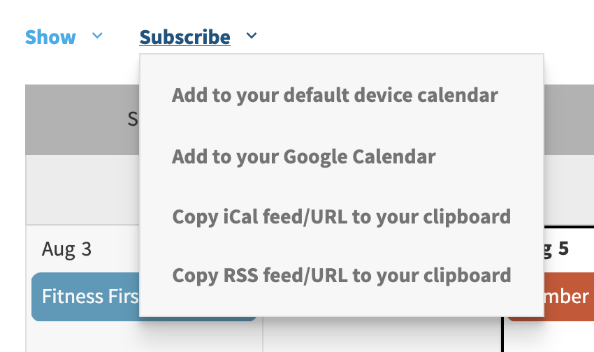 - Allow users to subscribe to feed: If you select this option, visitors will see a Subscribe drop down above your calendar where they can select to subscribe to your calendar feed to view your upcoming events or subscribe to your events in their device or Google calendar. (See image below)