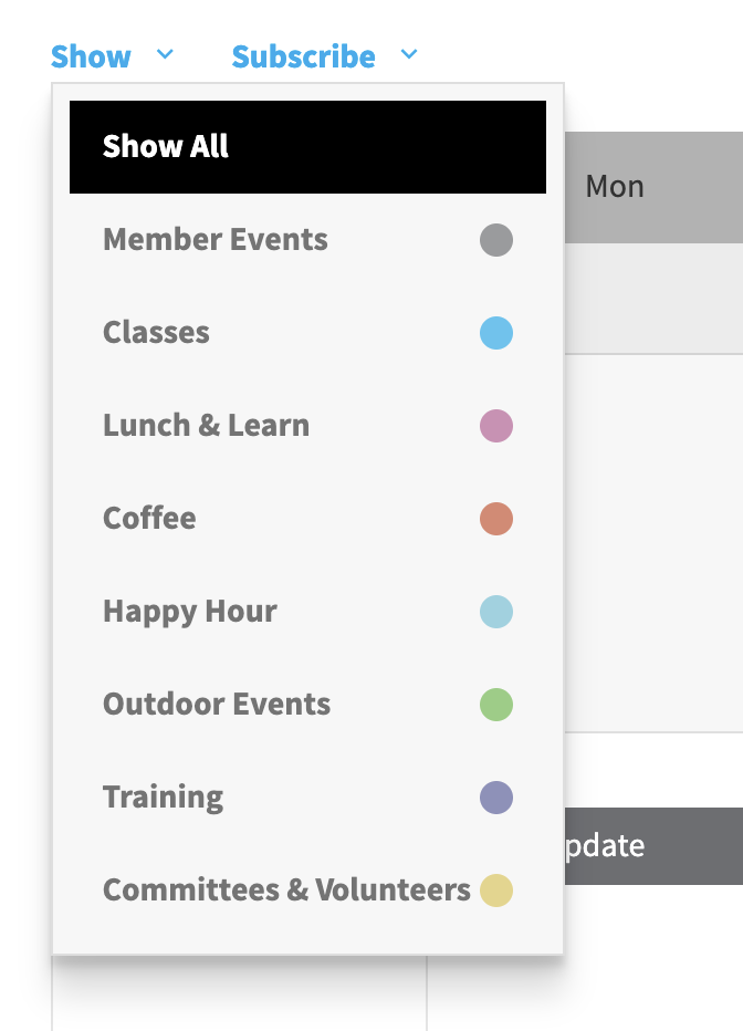 - Allow members to filter the calendar by category so they can see just the events from the category they select