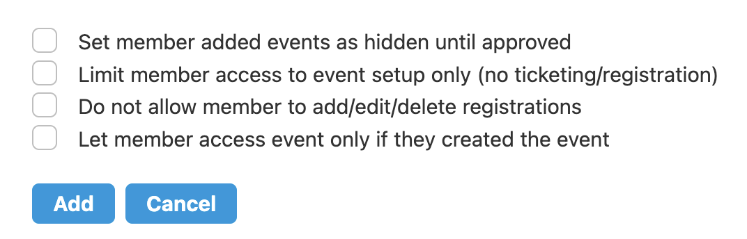 - Limit member access to event setup only (no ticketing/registration): You may want to allow members to add events to the calendar but not