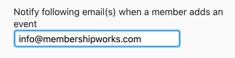 If you have allowed members to add, edit or manage events, you will see an option to enter an admin email address (or multiple email addresses separated by a comma) to be notified when a member adds an event.