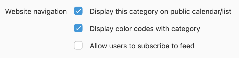 If you have restricted the event category to be visible to members only, you will not see the Allow users to subscribe to feed option next to Website navigation. This is because events in member only event categories cannot be added to a feed/calendar.