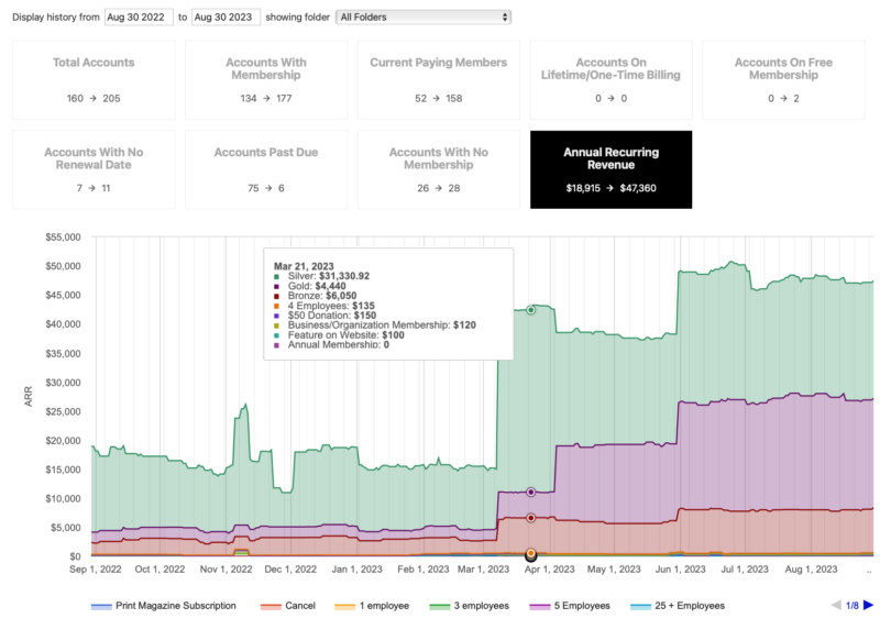 - Focus on “Annual Recurring Revenue” to see how the contributions of different membership levels and add-ons stack up.