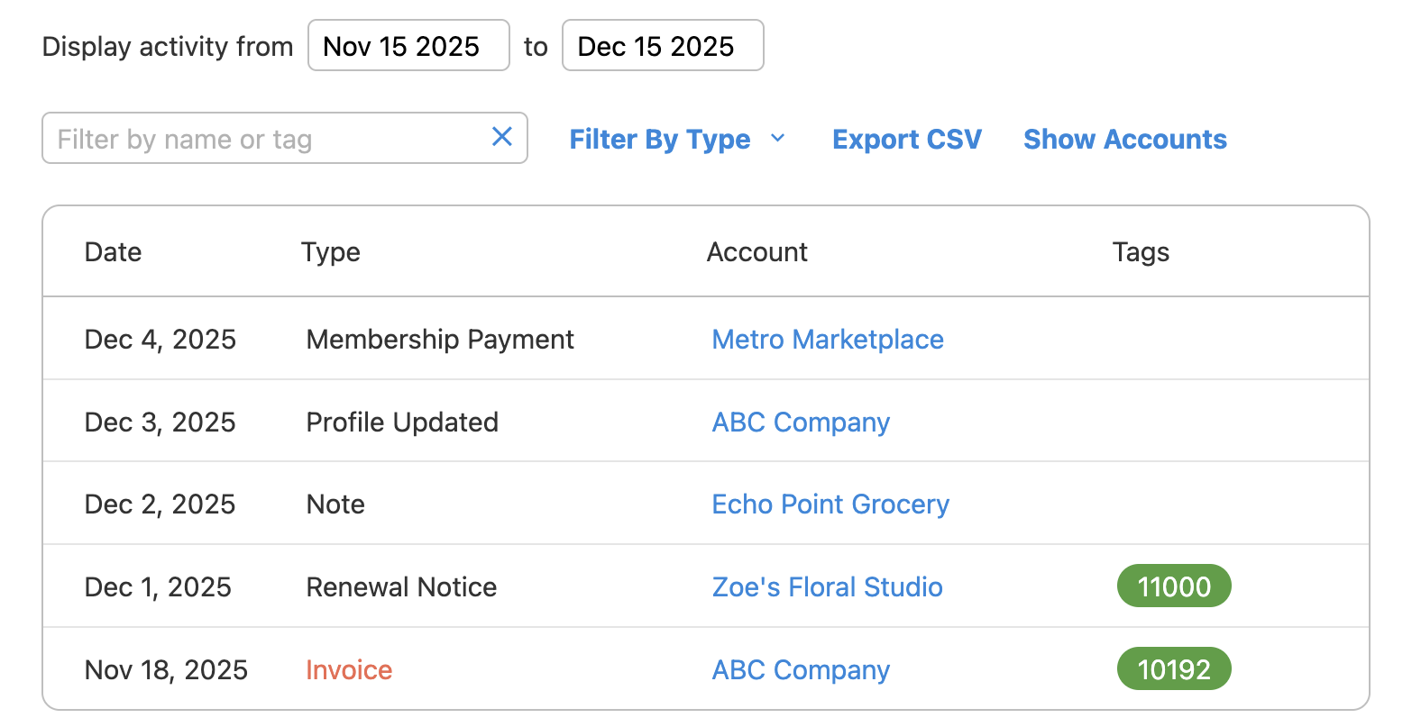This area pulls information from all of your members’ Timelines. You can narrow down information by utilizing the following features:
