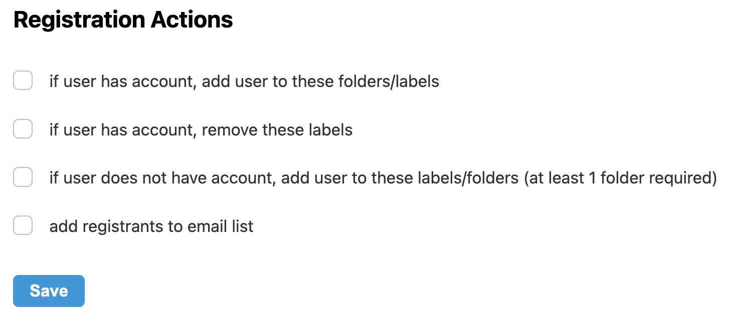 information. These Registration Actions under the Advanced tab let you automatically assign labels or folders to members when they register for an event.